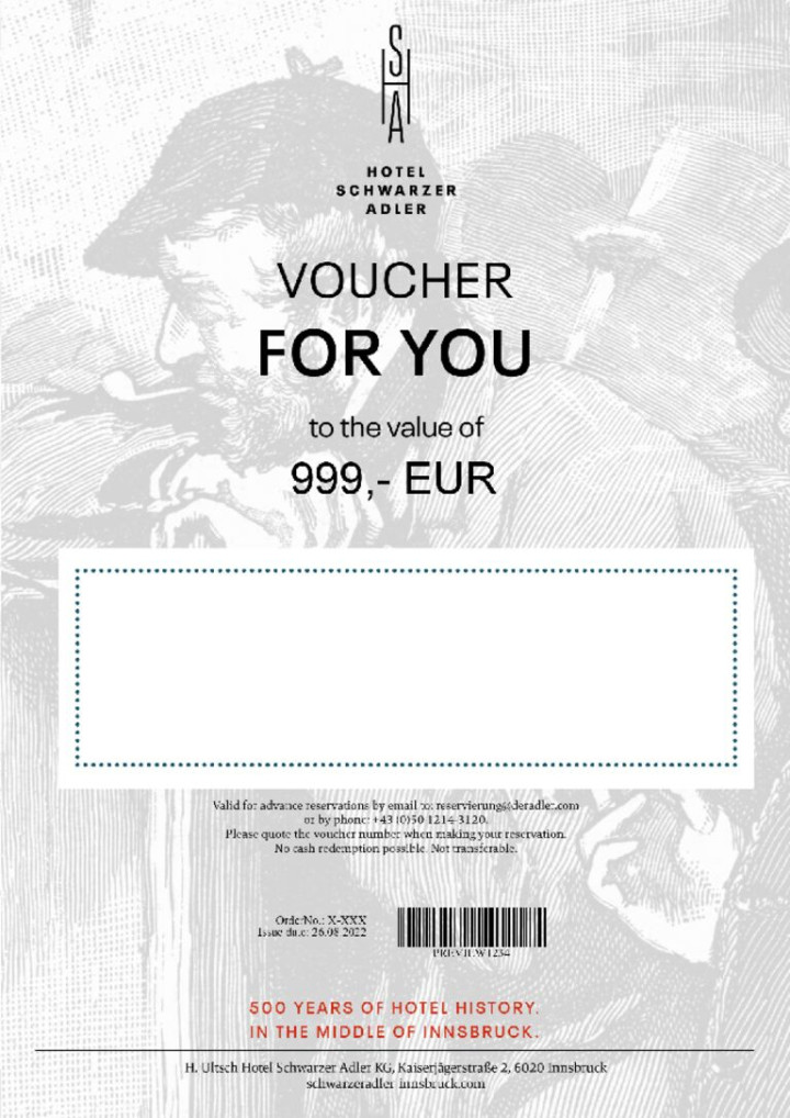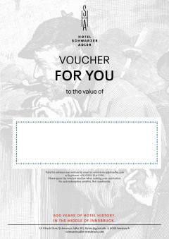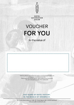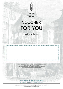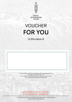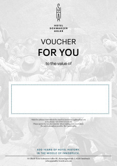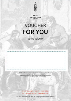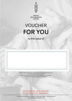 Surprise your loved ones with a visit in the heart of Innsbruck. Give them precious memories, time together or a heartfelt thank you with one of our value vouchers. You can redeem our vouchers according to your wishes - for an overnight stay, our rich breakfast buffet or a massage in our Crystal Spa.
