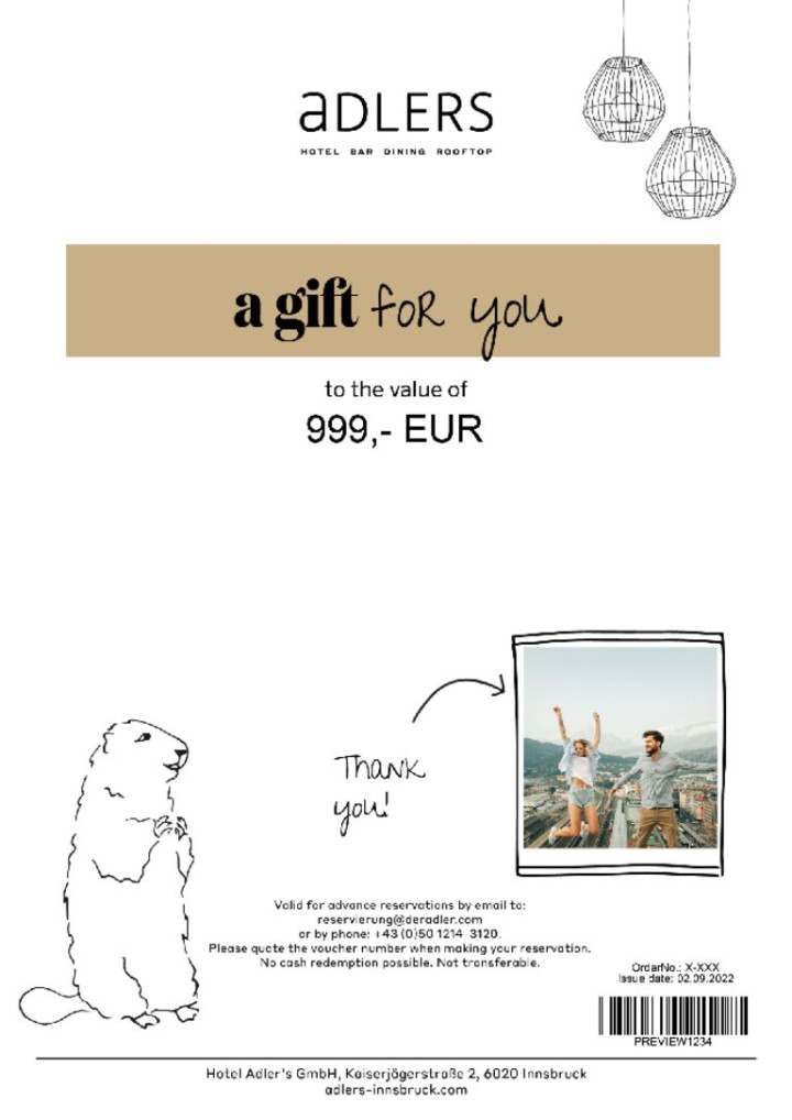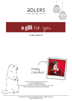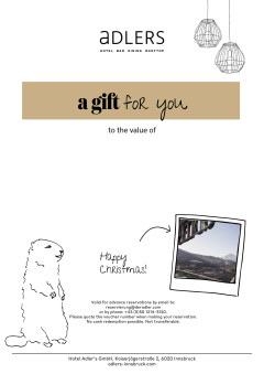 A greeting from the Alps - Surprise your loved ones and give away a thank you, precious time for two or shared memories in the heart of Innsbruck with one of our value vouchers. Overnight stay, breakfast or even massage - you can redeem our vouchers according to your wishes with us.