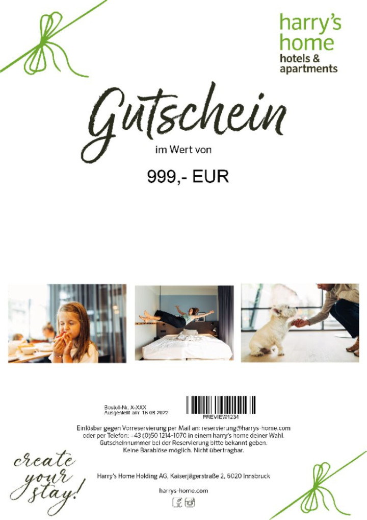 Überrasche deine Liebsten mit einem Besuch in einem unserer harry’s home hotels in Österreich, Deutschland und der Schweiz. Verschenke wertvolle Erinnerungen, gemeinsame Zeit oder von Herzen ein Danke. Den Gutschein kannst du ganz nach deinen Wünschen bei uns einlösen – für die Übernachtung, unser reichhaltiges Frühstücksbuffet und, getreu dem Motto „Create your stay“, all unsere zubuchbaren Leistungen.